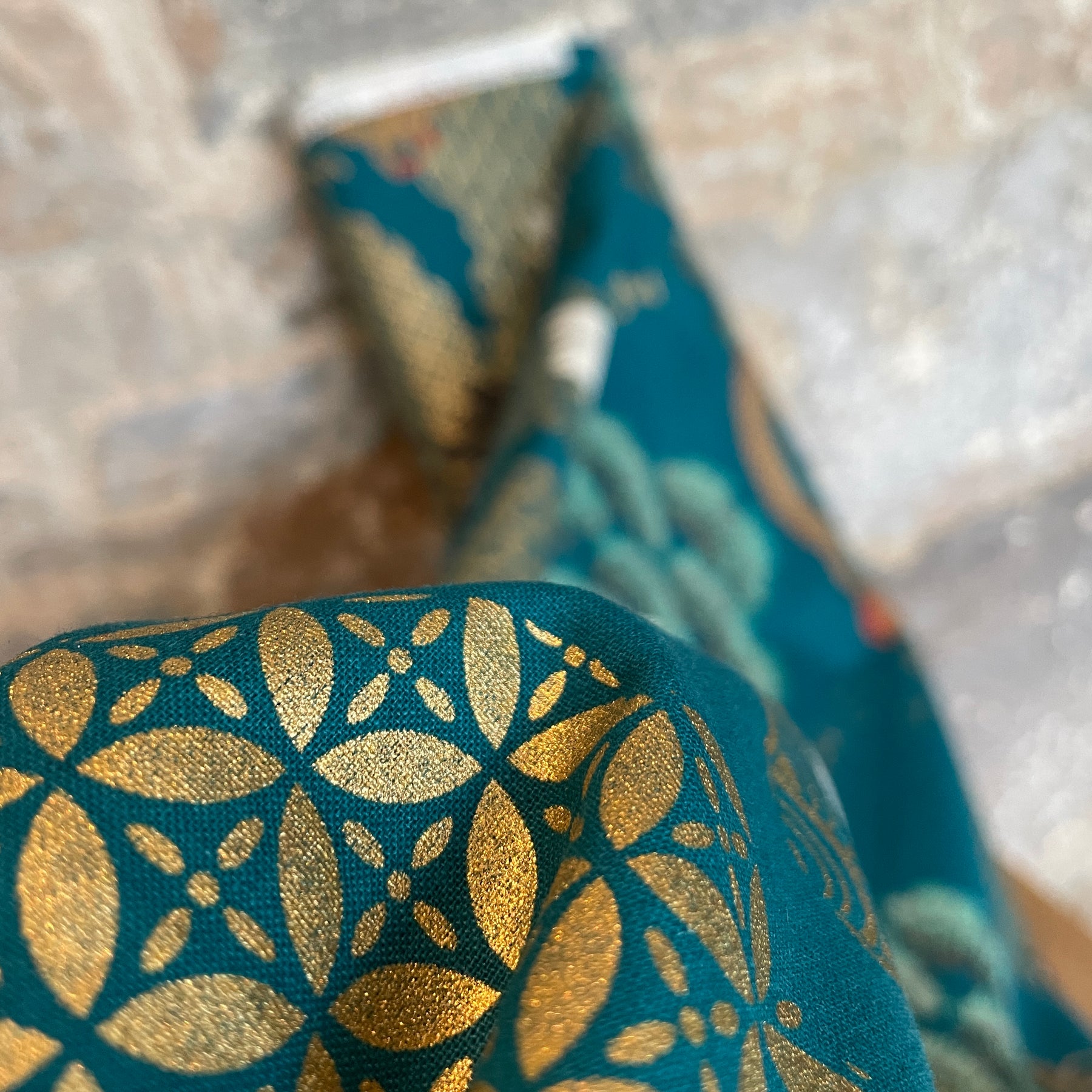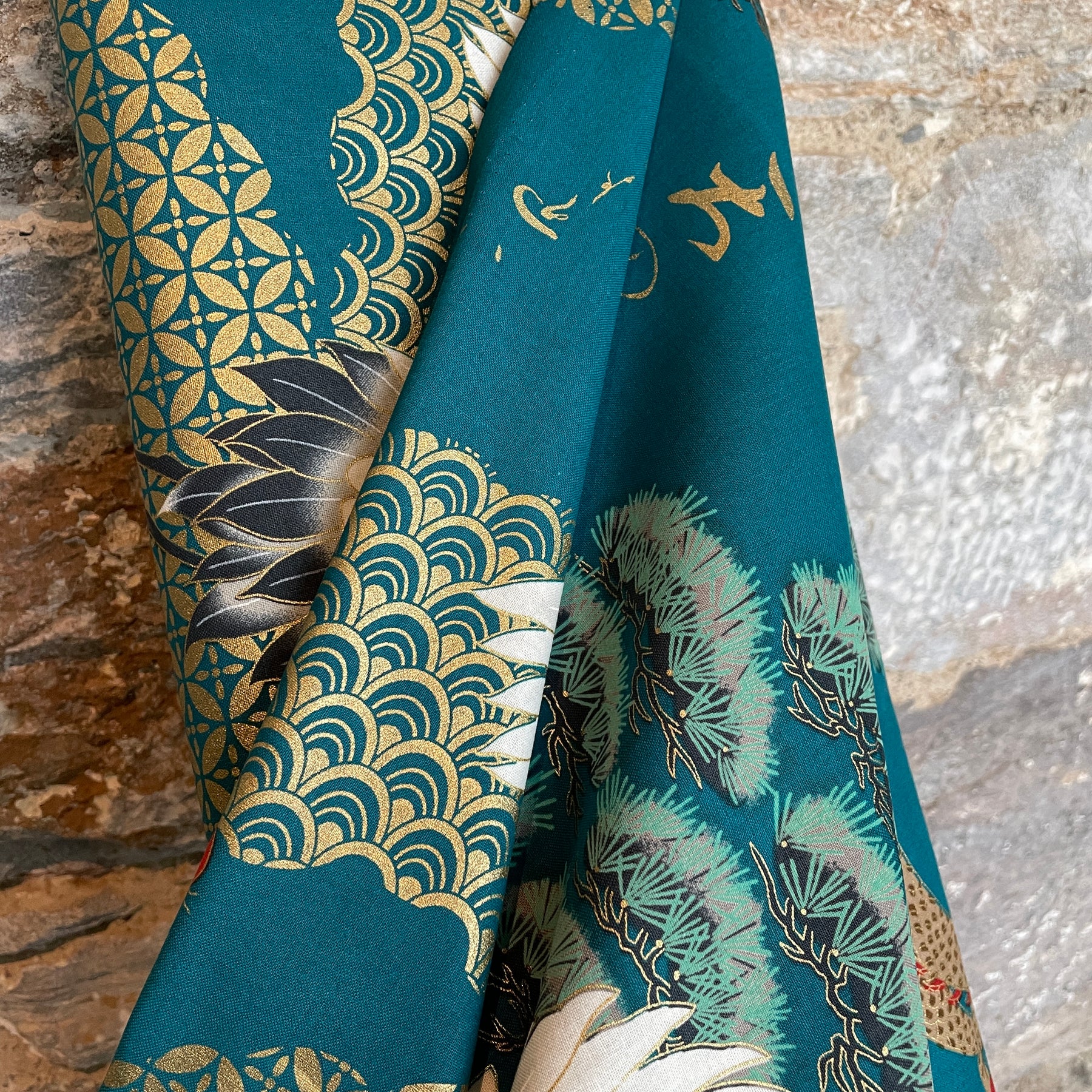 With gold leaf detailing a crisp cotton perfect for clothing, bag making and quilting